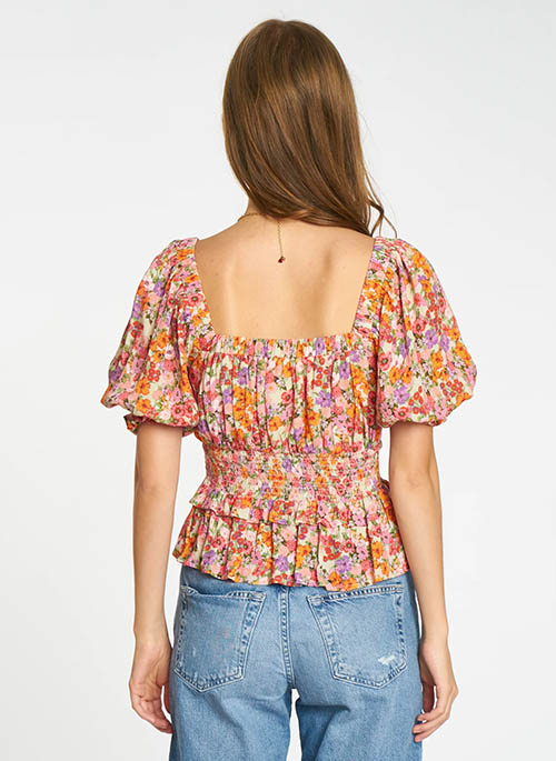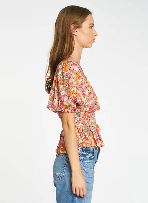 The Ramon Top is cut in an alluring Peach Blossom print of pink, red, orange, and purple flowers set against an ivory ground. With its square neckline and balloon 3/4 sleeves finished with ruffles along its smocked cuff, this blouse offers an easy day-to-night transition. Tiered peplum, smocked bodice neckline, and high waist details offer a delicate feminine finish that adds dimension to any look.