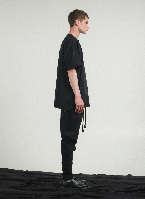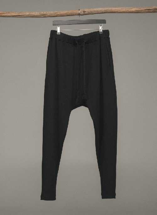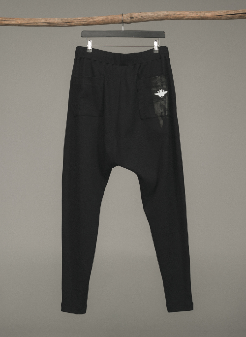Pants made from heavy-weight fabric with side and back pockets and a strong waistband. The style is a contemporary take on traditional riding breeches. The piece is finished with tapered fringe cords and hand-painted details on the back. The fabric is sourced from a qualified, European manufacturer and the garment is made ethically in Hungary.