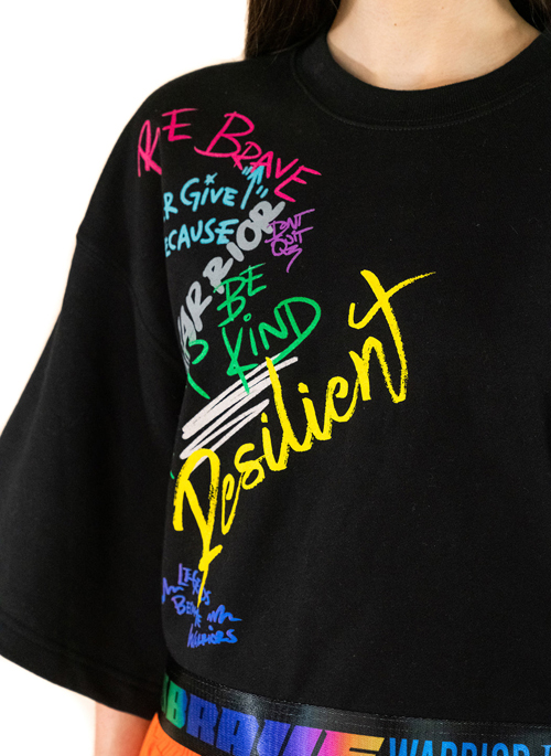 This women's crop top in black features graffiti-style text with empowering phrases and words themed around resilience in colorful letters: "Be brave," "Always be kind," and "Warrior."