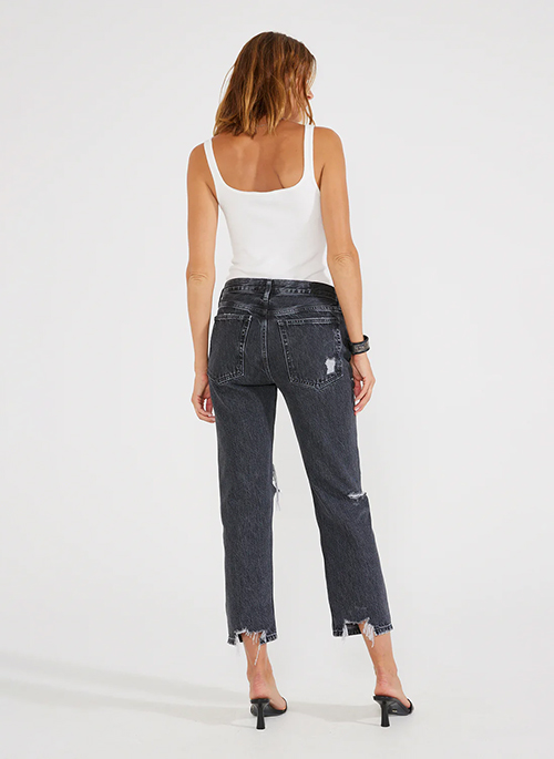 A clean straight fit with an easy rise and vintage construction. Rhea is fitted through the hip, then easy through the leg. A deep grey denim with destruction adds an authentic character.