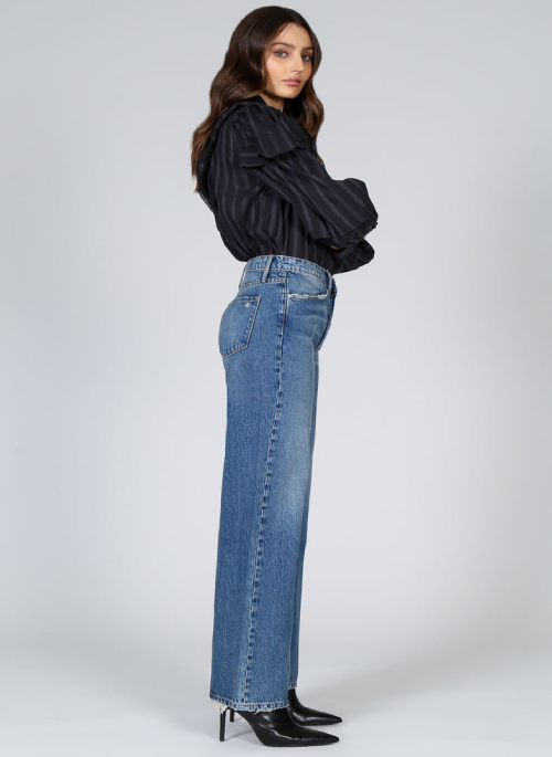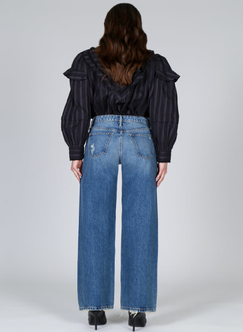 If you're going to talk to me at least call me by my name. High-rise, wide-leg, straight-leg jeans with a hidden button fly and a lightly distressed hem. Cut from our Vintage Rehab fabric to deliver 80's and 90's vibes while providing a modern fit, Call Me By My Name is a medium blue wash with light whiskering and sanding on the thighs.