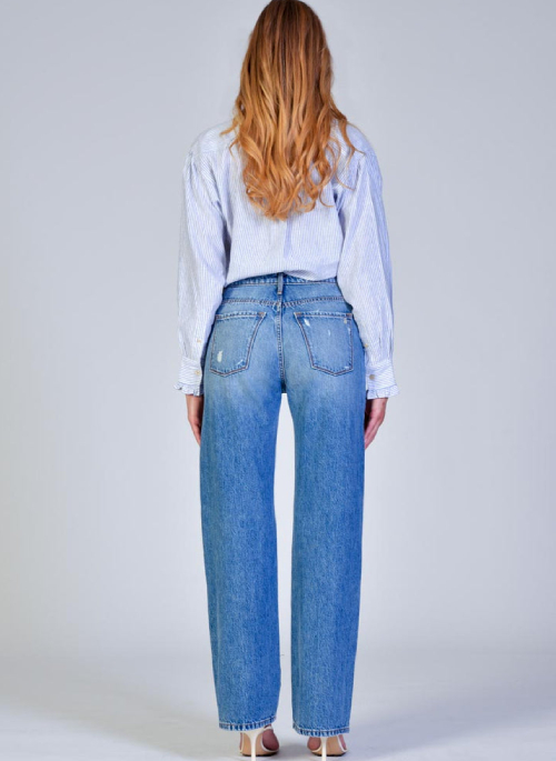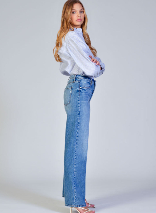 If you didn't get dirty, you didn't play. Wide leg high-rise straight leg in a medium blue wash with fading on the thighs. This jean features a button-fly and a rigid denim fabric.