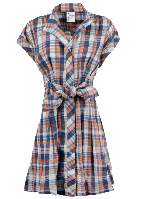 - Short sleeve plaid dress with a fitted shape. Hand wash.