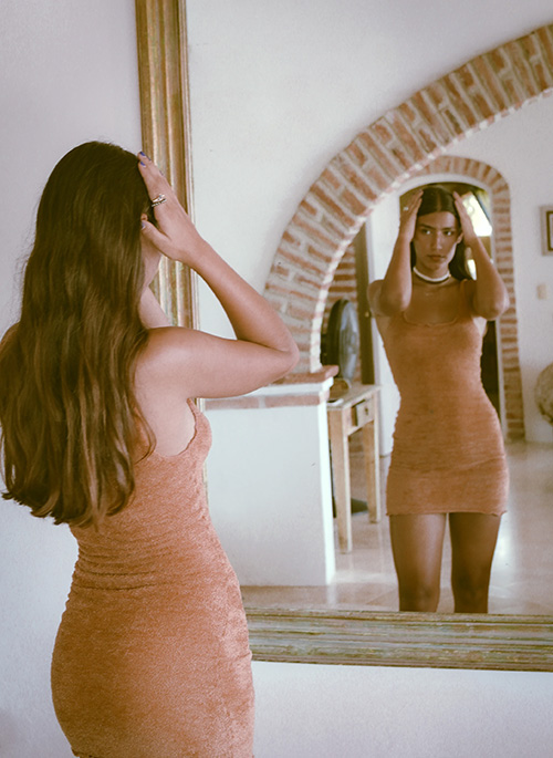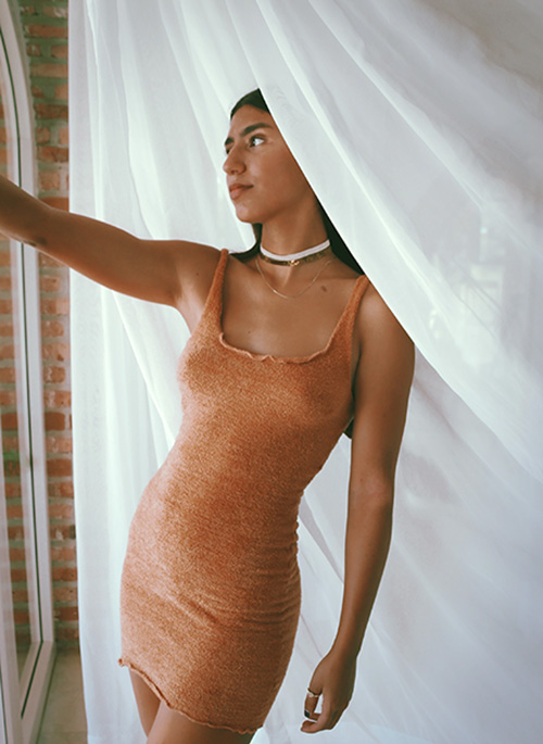 Fitted bodycon mini sweater dress with thick shoulder straps and U-shape front & back necklines. Featuring a cozy, soft and fuzzy sweater knit fabric in a burnt sienna color.