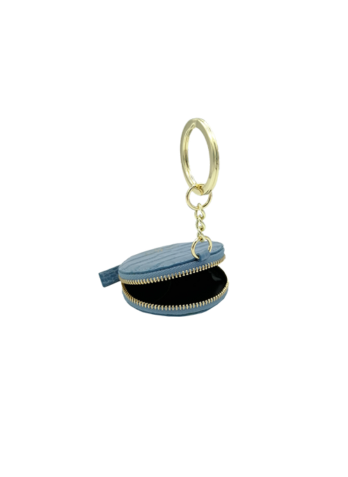 - Unisex key chain with round coin purse with gold zipper and a leather puller