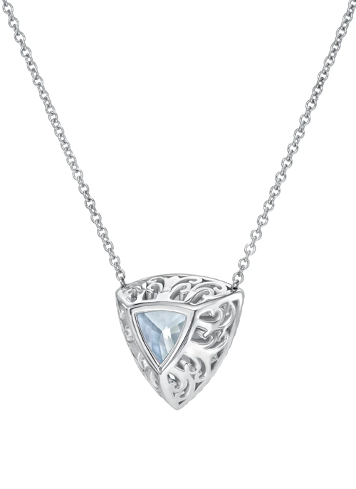 The shape of this statement necklace is inspired by the 3 sided outline shape of our Edward Avedis crest. The Aquamarine gem was cut to our designers specific measurements and set in a hand made filigree basket.