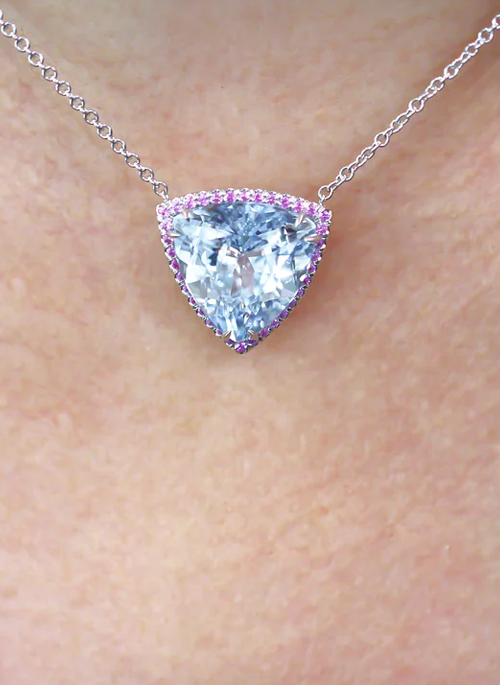 - The center Aquamarine is a 13.62 carats trillion shape embraced in a Pink Sapphire Halo of 0.60cts.