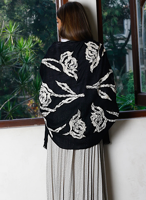 Woven from an incredibly soft cashmere, this black scarf features intricately designed, enormous rose applique cutouts handmade from a contrasting beige lace. With a wispy eyelash fringe finish at the ends this scarf is a signature head-turning accessory to any outfit year-round.