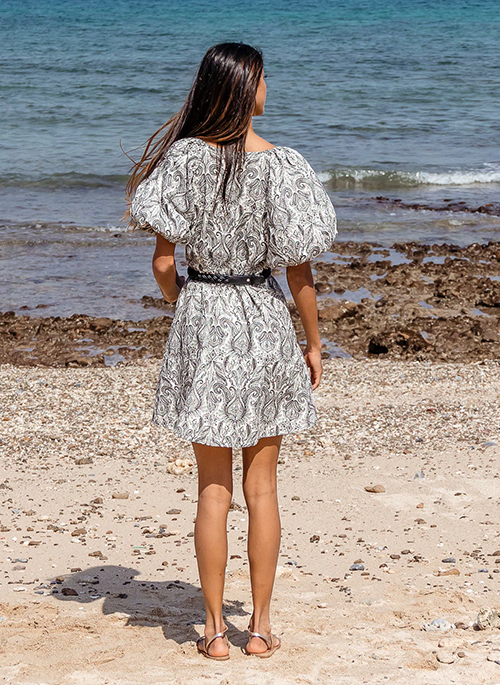 An absolutely unique piece with its all-over embroidered contrast artwork on crispy cotton poplin base. Volume balloon sleeves add attitude and the deep decolletage makes this dress ever so feminine. It comes with a detachable self-fabric belt, long enough to tie into a generous bow or why not using it with our hand braided leather belt LOUISIANA?