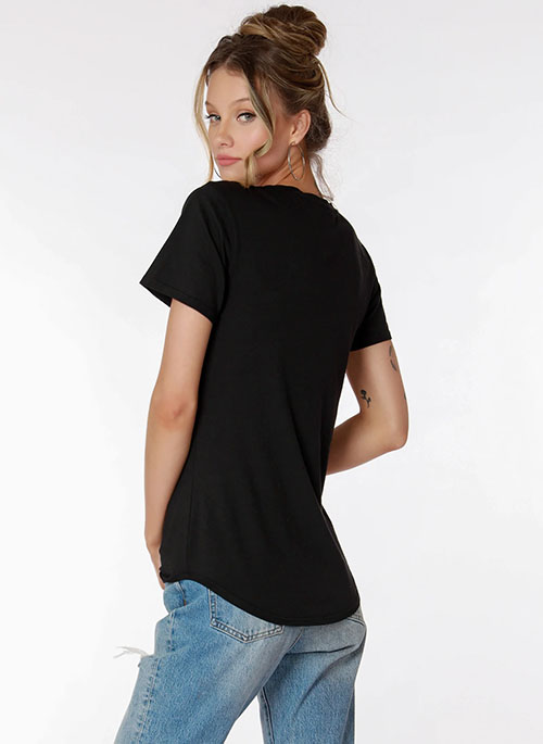 Add this chic basic tee to your closet for effortless style! Made in lightweight jersey fabric, this tee has an ultra-flattering v-neck, short sleeves, and rounded hem, making it an easy go-to item you'll wear on repeat.