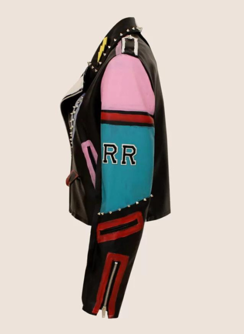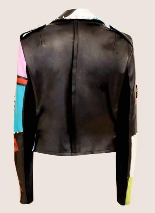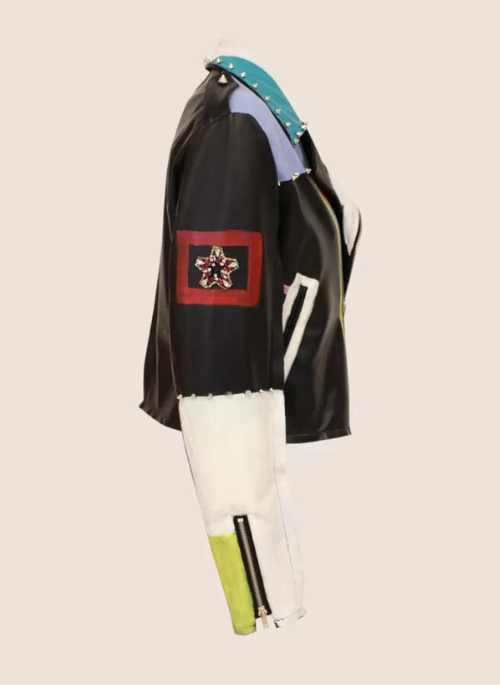 Leather jacket entirely hand painted with mirror lapels and front closure with off-center zip. Enriched with studs and raw cut seams and edges detail. Head designed and made entirely in Italy.