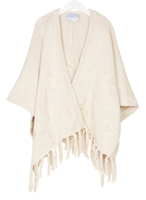 Knitted in the softestMerino wool, Machi is as versatile as it is luxe. With same-colour hand embroidered florals and leaves, note how the fringing frames this timeless piece.