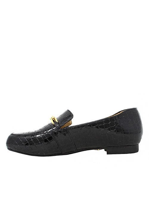 An alter texture in bold colors and a patent leather finish brings our new loafer to life with gold-plated link hardware.