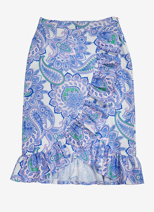 High-waist skirt made of cotton with beautiful paisley print. It has ruffles in same fabric and invisible side zip fastening.