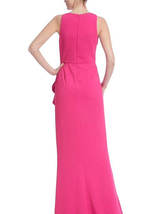 - Crafted with the utmost precision and attention to detail, this stunning gown features a sleek and stylish column silhouette that flatters every curve. The sleeveless design exudes an air of effortless elegance, while the artfully ruffled left leg slit adds a touch of playful charm to finish the look.