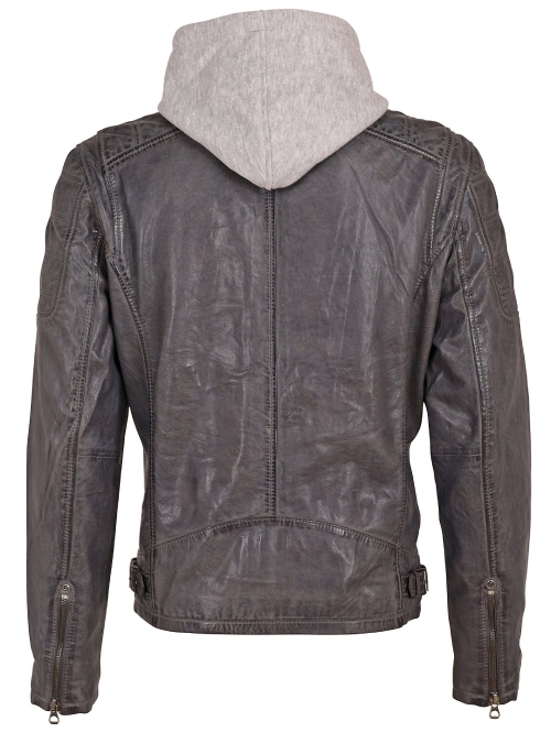 Classic leather jacket with a removable fleece hood.