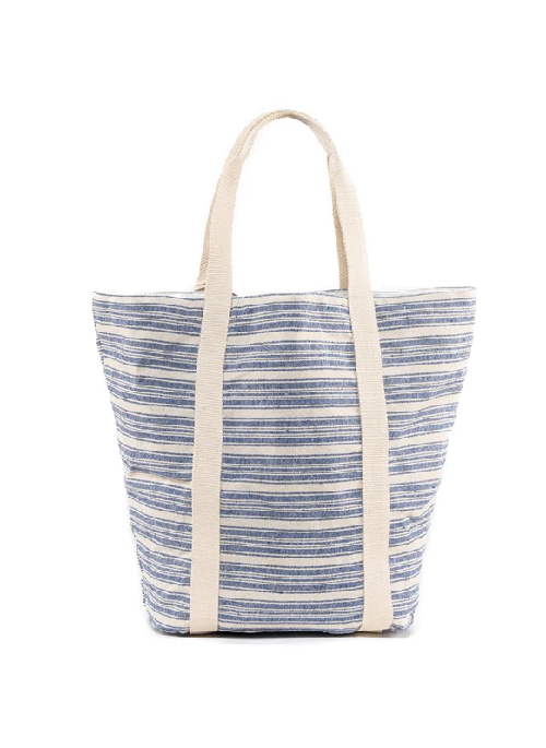 A new tote shape this season in our Sabai neutral stripe is the perfect size for a trip to the farmer's market, or the beach or to take with you on your next vacation. This tote features an inside open pocket, double snap closures and a removable handmade organic tassel pom.