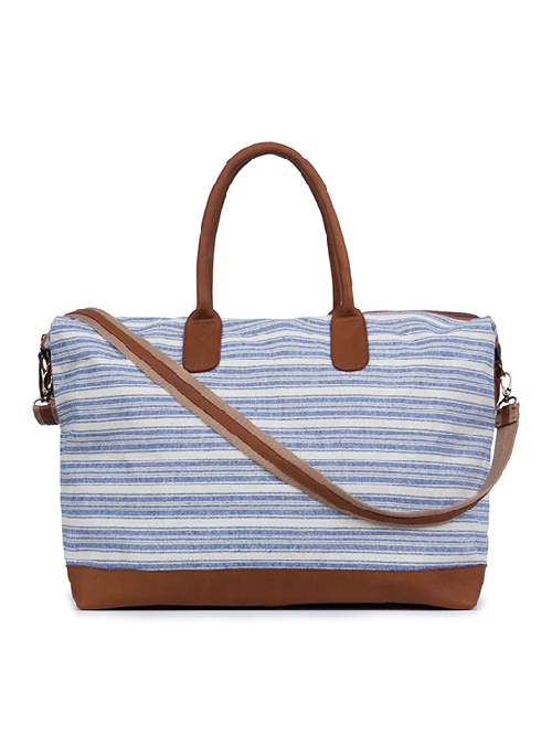 Our classic weekender is now offered in our new organic cotton Sabai stripe textile. This bag is perfect for a weekend away or an airplane carry on. It features ultra suede lining, an interior zip pocket, a crossbody leather-trimmed handle, and a detachable organic cotton tassel charm.