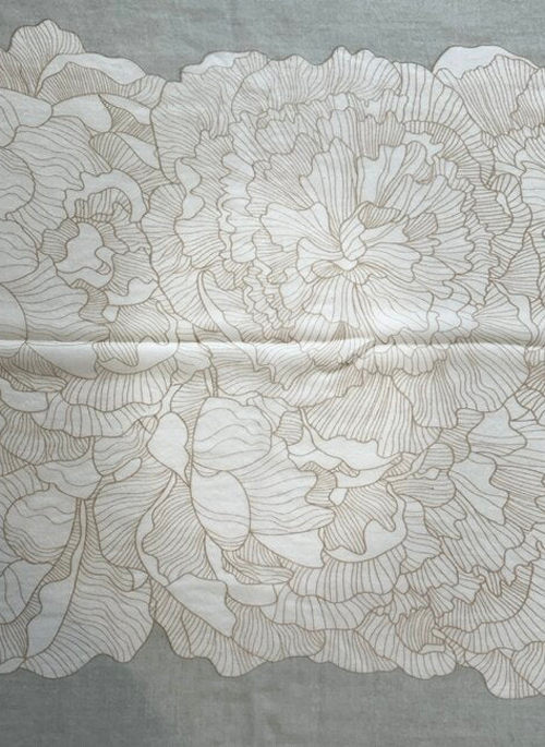 Floral design printed on 100% cashmere scarf in a light grey background. It has eyelash fringe ends.