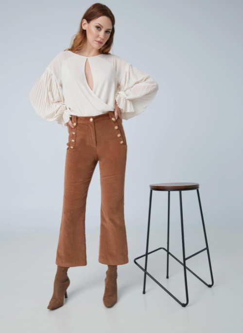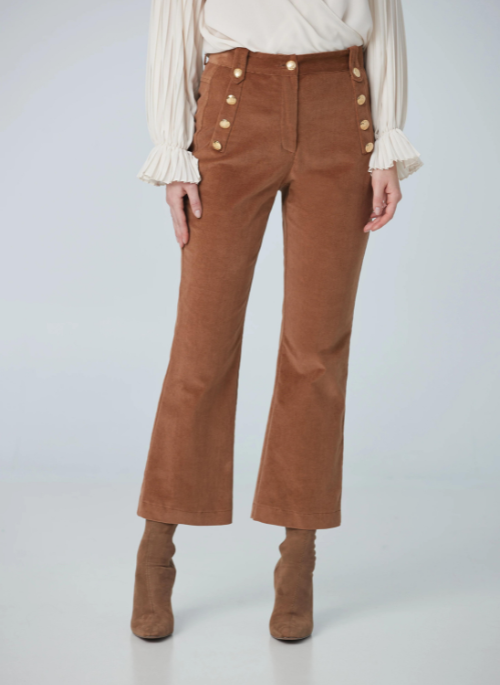 These mini corduroy sailor pants with front buttons are perfect with a blouse for work or a knit for a more casual look.