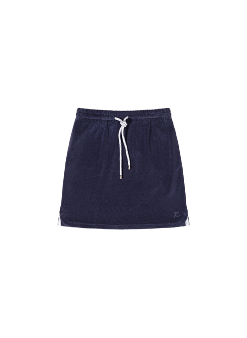 • Elasticated waist belt with navy and white striped cotton cord, chrome metal end cap finish, to tie