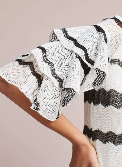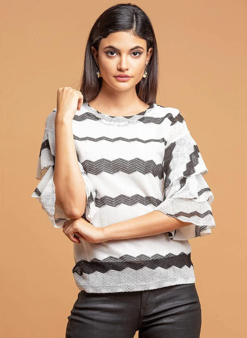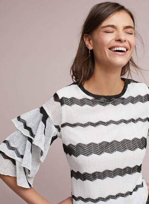 Fun chevron stripes and layered ruffles make this classic black and white top a special twist on a staple classic.