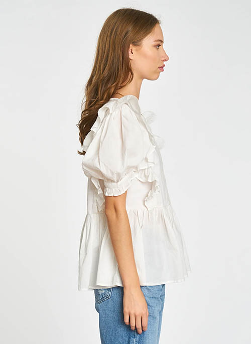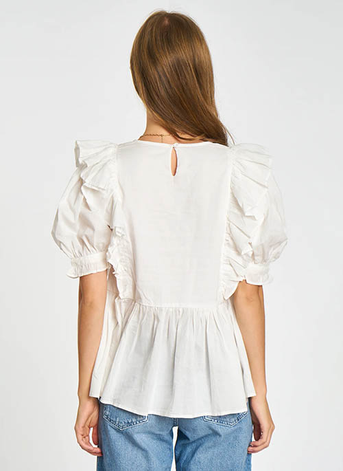 The peplum Sammy top, with its cascading ruffle detail to offset subtle princess sleeves, also features eyelet lace insets, creating a beautiful boho effect. Cut in a White eyelet woven, this blouse is a timeless design.