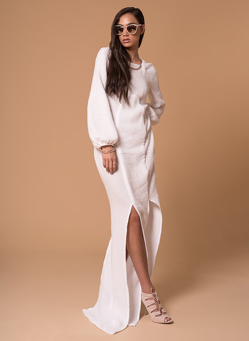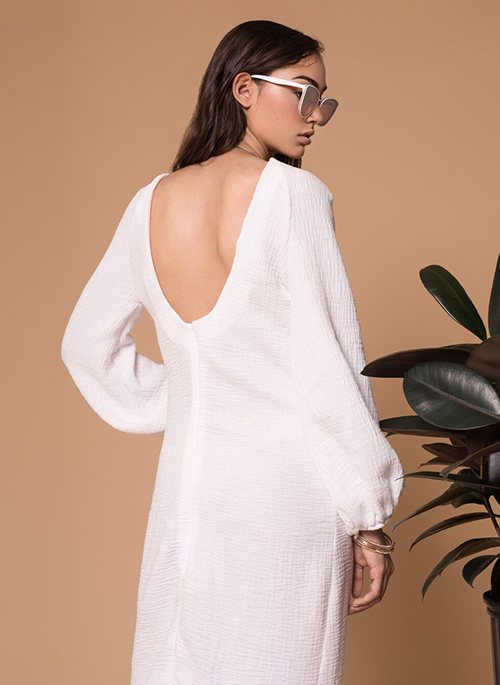 This diaphanous white triple-gauze maxi dress is pure bliss with it's soft texture and elegant drape. An invisible back zip & open back design as well as the front slits add a feminine & flirty touch. Perfect for a beachside stroll or for a fireside drink on a breezy evening.
