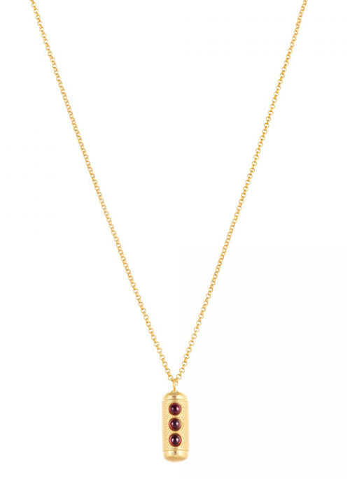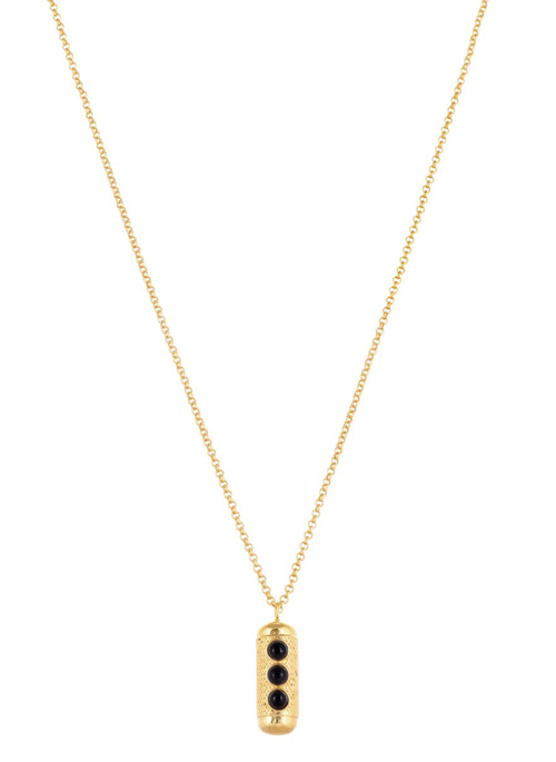 Our Sarovar pendant necklace resonates its inspiration with Pushkar Sarovar one of the five sacred lakes of India. Painstakingly crafted and gold-plated, the highly polished pendant, hung on an 18-inch rolo chain, features a beautifully engraved cylinder, set with three sparkling gemstones stones. The Sarovar necklace comes in amethyst, garnet, black onyx or labradorite, all the colors one can experience at Pushkar Sarovar.