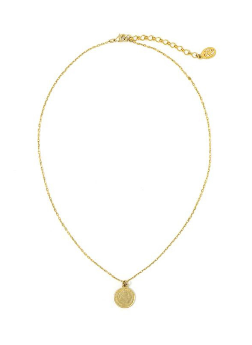 - Metal: 24 Karat Gold Plating. Pewter coin and brass chain core.
