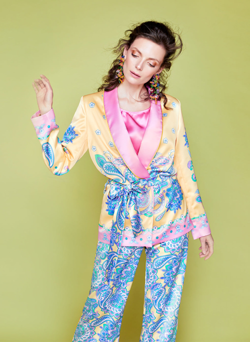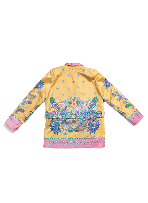 Yellow blazer made of soft satin with beautiful paisley print in green, pink and blue. It has long sleeve with a lapel collar and shoulder pads and tied belt in the same fabric.