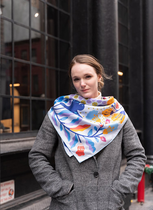 This double sided silk scarf printed on both sides with different color! You can simply flip the scarf onto its other side when you get bored of the other. Inspired by the relationship between nature and human. Hand illustrated designs which connecting fine art, fashion, and nature.