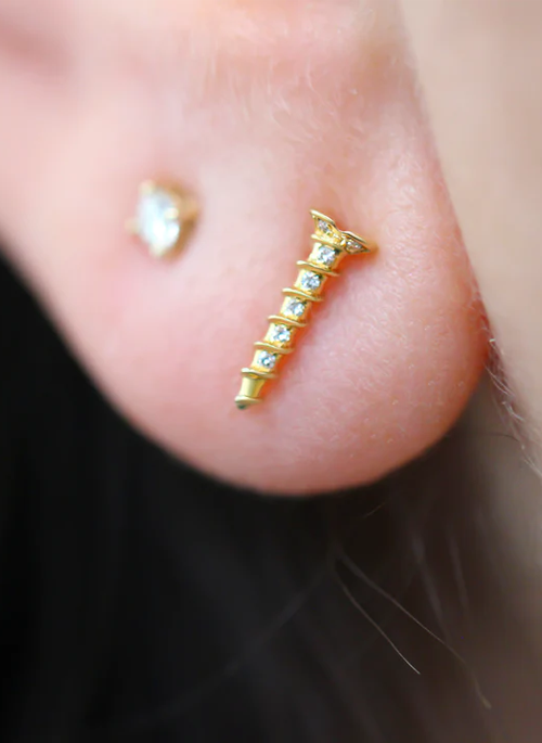 Adorable 14k yellow gold screw earrings with 0.04ctw diamonds along the side of the screw.