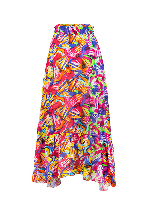 Summer asymmetrical skirt, slightly shorter at the front. Finished with frills with a belt that can be tied at the back or at the waist.