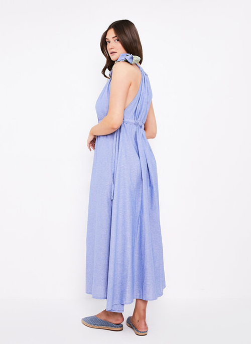 Beautiful Cotton Chambray dress with adjustable neck and waist ties. The neck line features Cocoove tranquillity print.