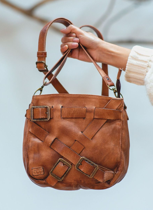 Hey there buckles, how cute are you? Shenzi is a compact tan leather crossbody with a fun front panel composed of woven leather pieces, and cool decorated metal buckles. A zip top closure keeps contents secure, and the removable and adjustable strap makes Shenzi an option for tall and small. Buckle up in this beauty, Shenzi has a day date with you out and about looking adorable.