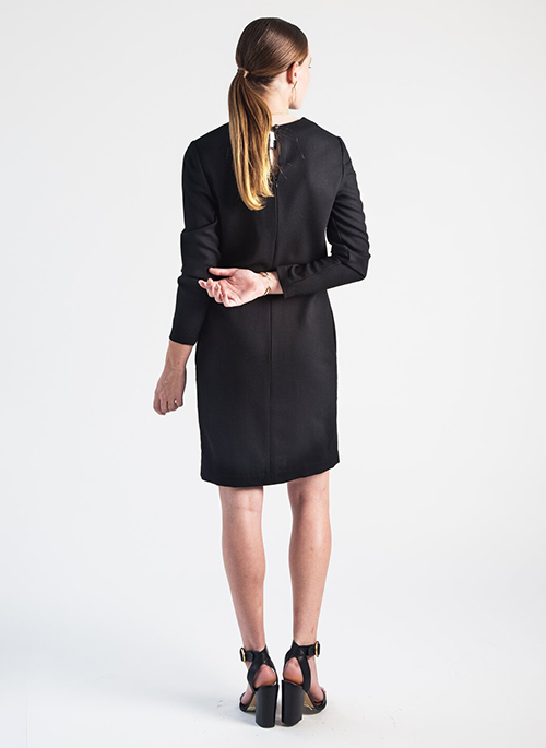 Lightweight black wool crepe sheath dress with side-seam pockets and zipper at center back, bound seams, and sophisticated blind hem finishes. Perfect for desk to dinner. Versatile and made to last.