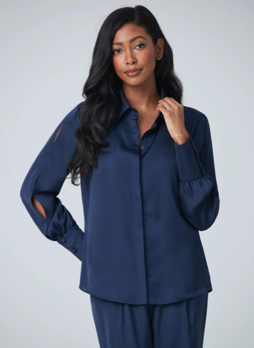 This smooth and shiny blouse made out of a frabric imported from Portugal stands out for its comfort and elegance. The slit detail on the sleeves makes this blouse unique and chic no matter what you pair it with.