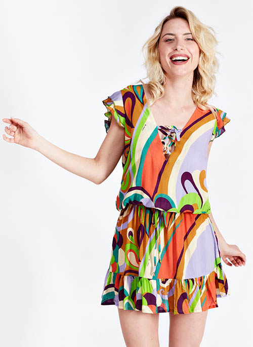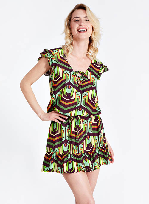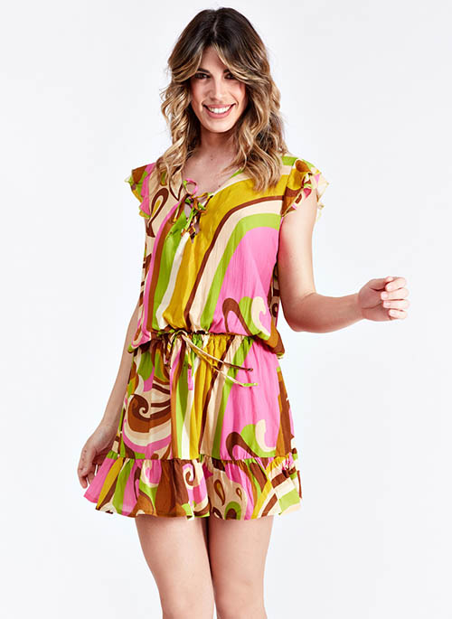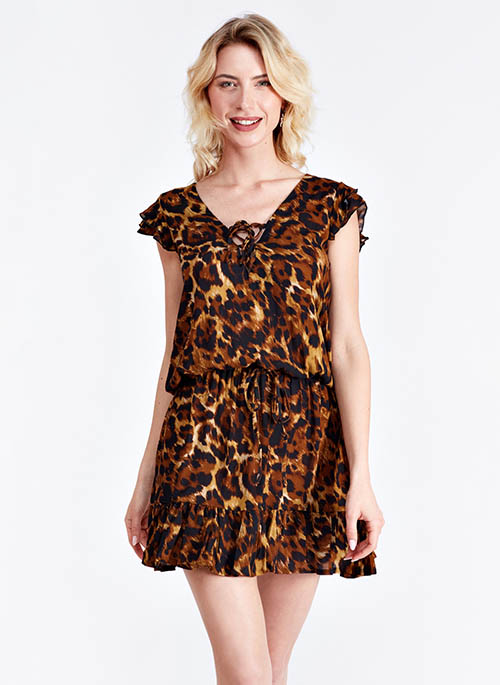 Enjoy the summer with an always impeccable outfit. This short and flowing dress is the perfect solution for an effortlessly comfortable and sensual look. Mini dress with winged sleeves embellished with light ruffles and a neckline adorned with an intriguing interweaving of tone-on-tone strings, ideal for wearing on the beach and at aperitif time. A small flounce and the drawstring at the waist enhance the whole silhouette, highlighting the waist. Made in seductive animalier or fun shiny cormie, it's the perfect mini dress for a summer full of style.
