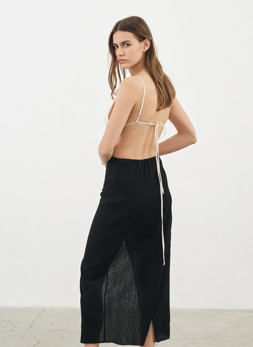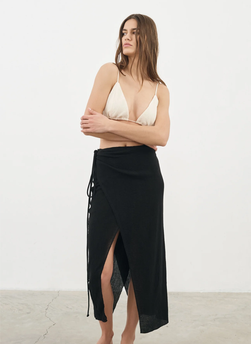Whether you are beach hopping or cocktail in hand, the Sia Skirt Black is our staple summer essential. Features an adjustable tie waist detail, double layered on top part and front slit. The lightness of the fabric makes it perfect for vacations, especially styled with a bikini at the beach.