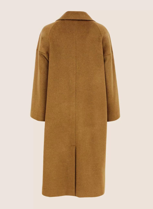 Classic long coat in camel-colored wool cloth with raglan cut, wide lapel collar and single-breasted two-button placket. Featuring the hand-drawn and crafted detail of brooches and moth and eye-shaped patch appliqués, it has a center back vent and two front patch pockets on the front. Head designed and made entirely in Italy.