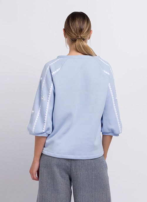 This spring summer friendly relaxed silhouette jumper with lace trim sleeves adds a touch of elegance to your capsule wardrobe. The hand embellished motifs consist of shell shaped sequins and beads. The top is crafted from GOTS certified organic cotton. This piece is made with eco friendly materials in line with the brands sustainability movement. Style yours with our linen shorts or smart trousers for an elevated looks.
