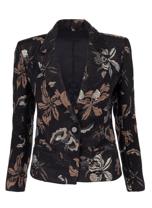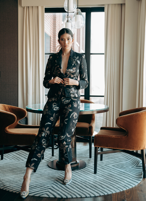 Structured Peak Lapel Blazer with Italian black glass button & smooth black silk charmeuse lining. The outer fabric is woven to order in France and features light pink, grey, and shimmery threads on a black background with matte texture. This style provides maximum confidence with 1" shoulder pads, and several layers of specialty interfacing that provides a strong silhouette while being lightweight and comfortable to wear. Other details include a contoured two-piece sleeve that allows for a great fit, 2 clean finished back vents for ease of movement and shape, angled welt pockets lined in silk at the front large enough for most phones, and a subtly angled hem & center front seams for the ultimate figure flattering shape.