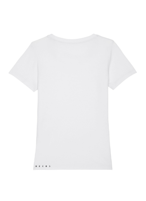 Women's T-shirt in white made from GOTS certified organic cotton. Slim fit with slightly distant neckline. Very comfortable to wear, perfect fit. Does not warp after washing. With discreet motif print on the front. A basic piece for every day. Goes with everything. REER3 - Good for Planet, People, Animals