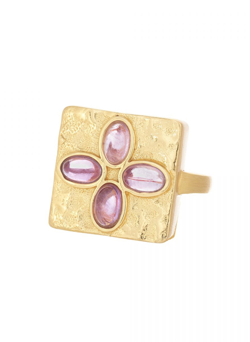 This small hammered and brushed gold-plated square ring, has a design that is beautifully simple, transcending time, deliciously embellished with four oval cabochons in the centre – and it comes in a choice of labradorite, amethyst or garnet.