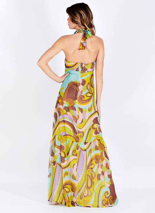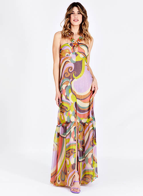 Long dress in Onda print is the elegant solution to stand out during parties and events and ceremonies. The silk embellished with lurex threads outlines a totally feminine silhouette. Strapless but adorned with a colored chain that embellishes the decolette gives.