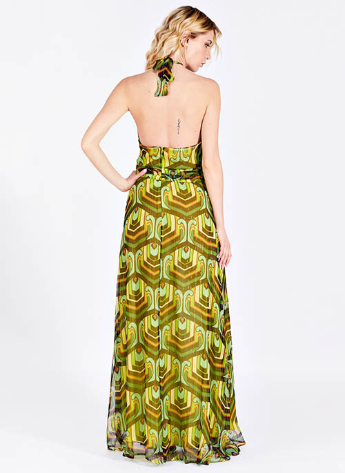 Let yourself be captivated by the bright colors of this geometric print dress. Wide silk dress, perfect to wear during parties and summer events. Intriguing back neckline and shiny lurex threads embellish this garment with a precious allure. Cut-out details and an enamelled brass accessory will give this elegant maxi dress an edge.