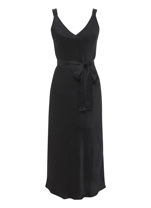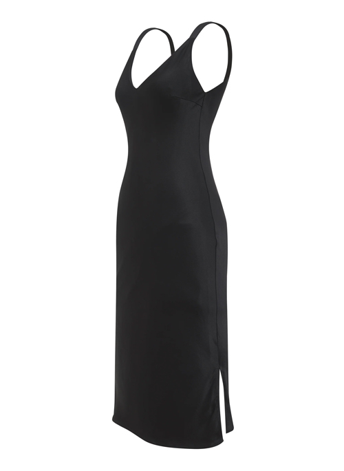 V-neck midi/knee length and bra-friendly dress cut on the bias. This slip-style dress is made out of a luxe viscose and rayon satin. The fabric has a weight that produces a beautiful drape on the body. It comes with a matching belt that can be worn as a headband, necktie, or other chic accessory. The dress is finished with a leg slit on the left.