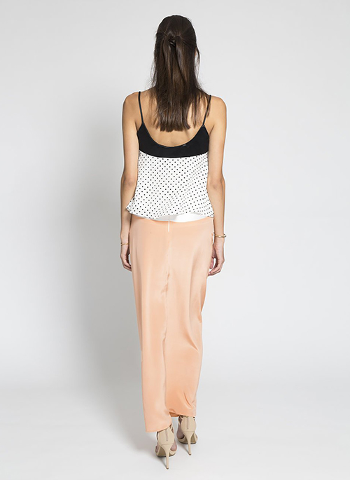 A-Line Silk Crepe de Chine Tank with spaghetti straps and contrast panel of Silk/Hemp Charmeuse. Fully lined. Versatile and feminine top with sweetheart seam detail.