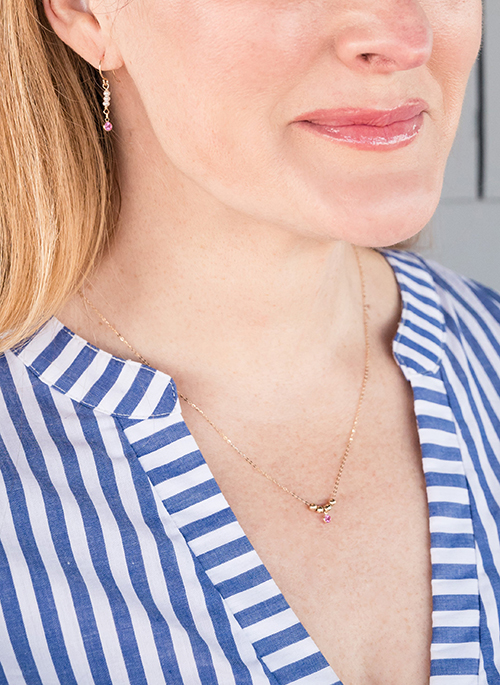 A shorter version of our "Single File" pearl and 14K gold earrings, these pearls and drop pink sapphire are ready for your everyday look! Gold, pearls, and pink sapphires complement the pieces you already own, we just know it!